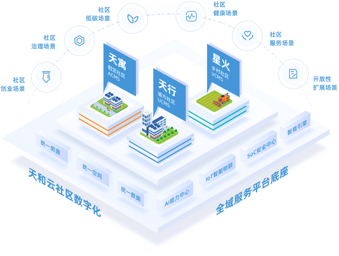 专注城市、乡村、租住三大社区领域,打造更舒星、更安星、更贴星、更智星、更暖星的五星社区数智化服务体系:未来城市社区云-“天行”UCMS SaaS;未来乡村社区云-“星火”VCMS SaaS;未来租住社区云-“天寓”ACMS SaaS
